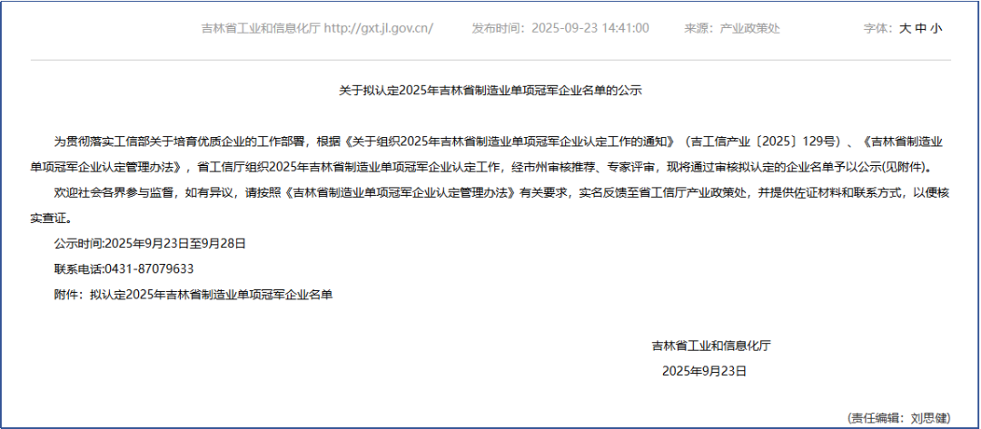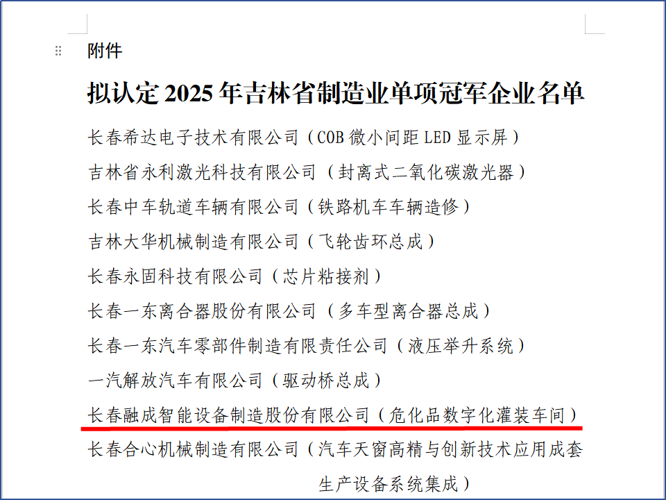 近日,吉林省工业和信息化厅对获得2025年制造业单项冠军企业及产品进行了公示,融成智造依托自主研发的“危化品数字化灌装车间”产品获得认定。卓越的产品性能、过硬的质量标准和专业的服务保障,再次彰显了公司在智能制造领域的硬核实力。